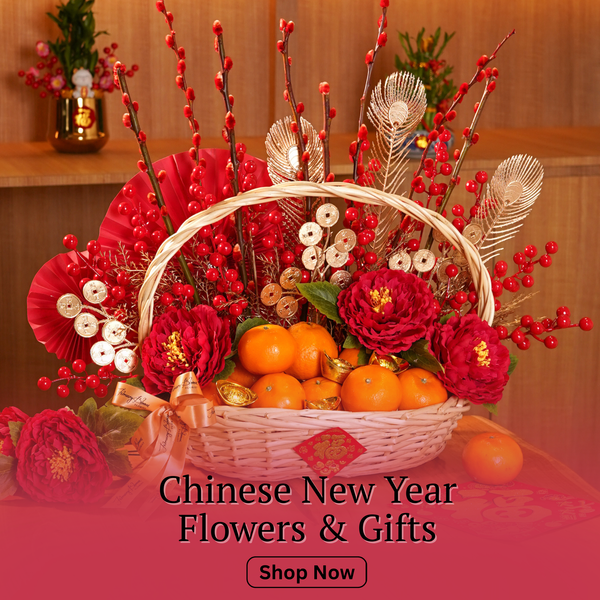Chinese New Year flower hamper made with fresh flowers and festive design. A thoughtful gift to send New Year wishes, prosperity, and happiness. Delivery available for homes and offices.