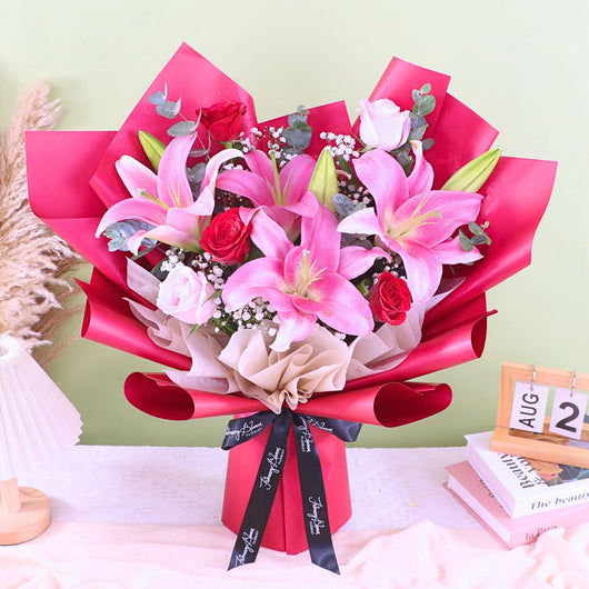 Celebrate with the vibrant Mulan Lily Bundle, a stunning Birthday Flower Bouquet featuring fresh lilies, roses, and a playful air balloon. Perfect for someone special to be always blooming with joy and beauty!