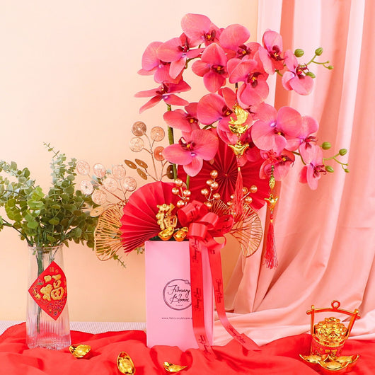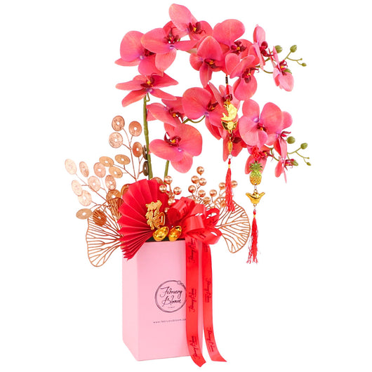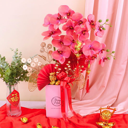 Prosperity inspired Chinese New Year flower box designed with elegant artificial orchid arrangements and festive CNY decorations. An affordable, long lasting gifting option for homes or offices, making it one of the best Chinese New Year gifts with same day delivery available across KL & PJ...
