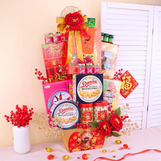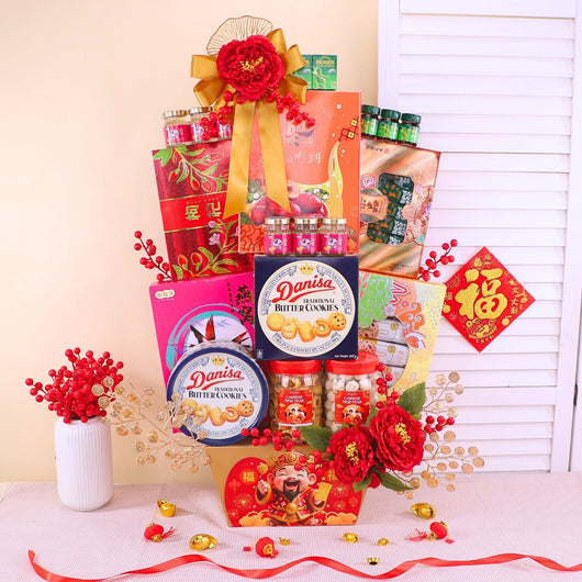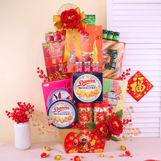 Celebrate Chinese New Year with a delightful CNY Flowers & Gifts Hamper featuring cookies, coffee, a mix of festive variety items, and elegant artificial flowers. Offered at an affordable price, this best CNY gift hamper comes with same day delivery in KL for joyful festive gifting...