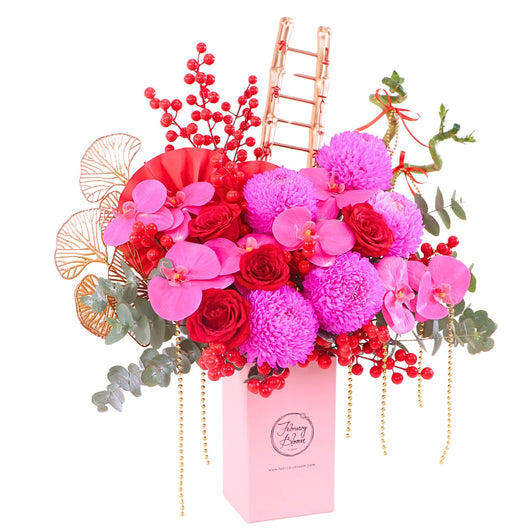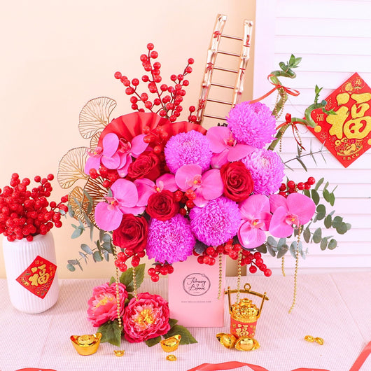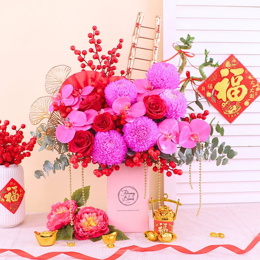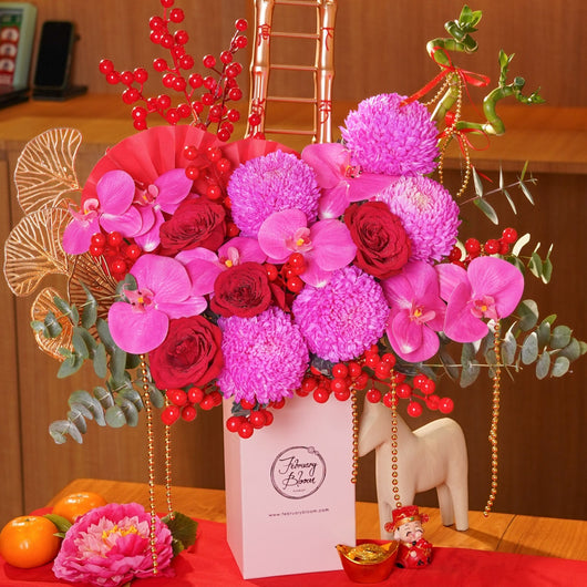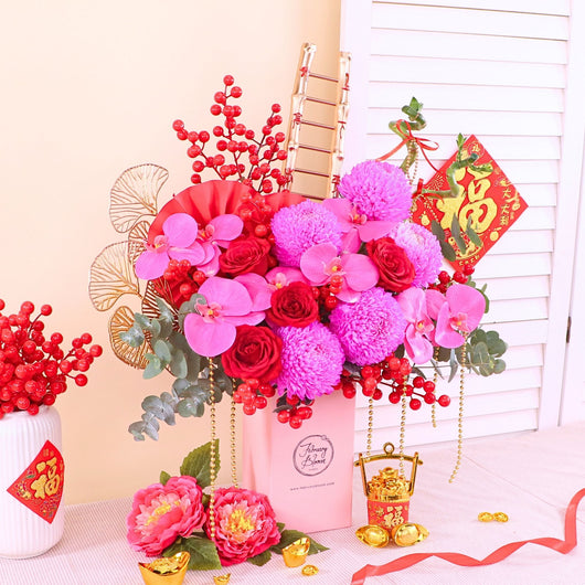 Chinese New Year Bloom Box featuring fresh Chrysanthemum, roses & artificial Orchid, symbolising luck, love, and prosperity. Designed at an affordable price, it’s a meaningful festive gift with trusted CNY gift delivery KL & PJ for homes and offices.