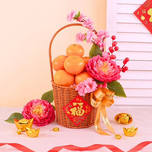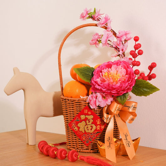 Bring joy this festive season with our Chinese New Year Fruits & Flower Basket featuring fresh orange with artificial flowers, elegantly arranged at an affordable price. Express prosperity and luck through a meaningful gift. Secure trusted CNY hamper delivery KL & PJ for smooth festive gifting...