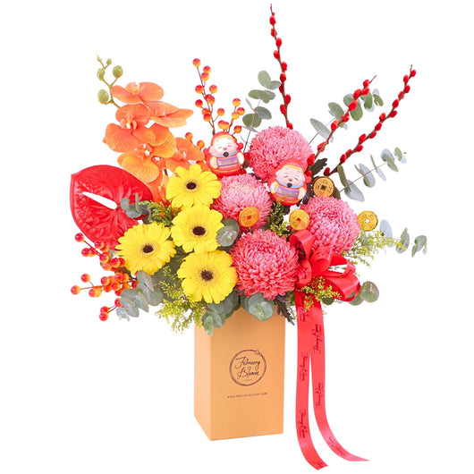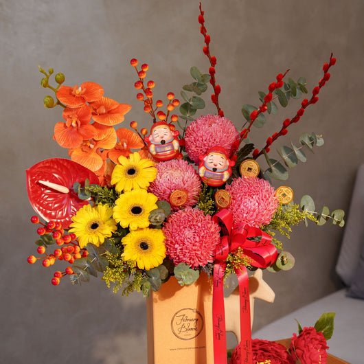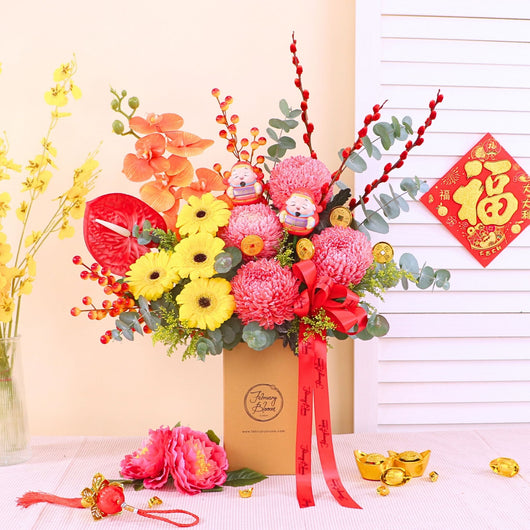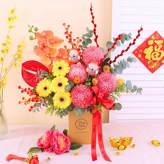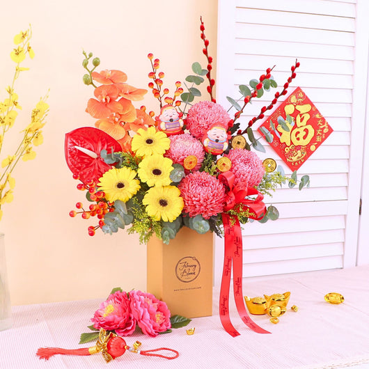 Charming Chinese New Year flower gift featuring a vase of fresh flowers with a lucky fortune cat and festive CNY decorations. An affordable yet thoughtful gifting option for homes or offices, making it one of the best Chinese New Year gifts with same day delivery available in KL & PJ...