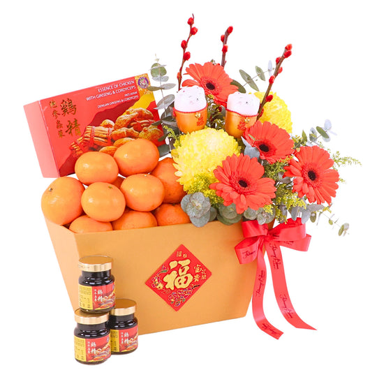 Bring joy this festive season with our Chinese New Year Fruits & Flower Basket featuring fresh mandarin orange with artificial flowers, elegantly arranged at an affordable price. Express prosperity and luck through a meaningful gift. Secure trusted CNY hamper delivery KL & PJ for smooth festive gifting...