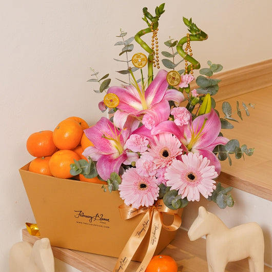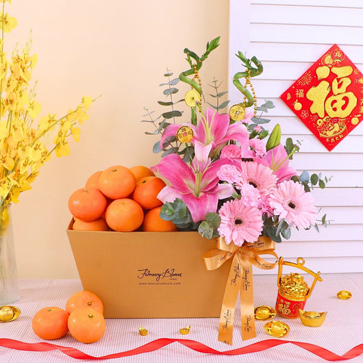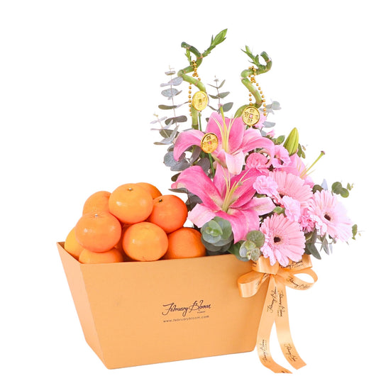 Bring joy this festive season with our Chinese New Year Fruits & Flower Basket featuring fresh mandarin orange with artificial flowers, elegantly arranged at an affordable price. Express prosperity and luck through a meaningful gift. Secure trusted CNY hamper delivery KL & PJ for smooth festive gifting...