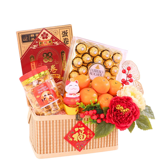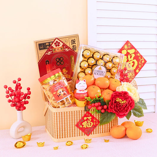 Bring joy this festive season with our Chinese New Year Fruits & Flower Basket featuring fresh mandarin orange with artificial flowers, elegantly arranged at an affordable price. Express prosperity and luck through a meaningful gift. Secure trusted CNY hamper delivery KL & PJ for smooth festive gifting...