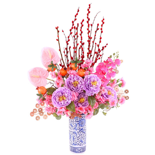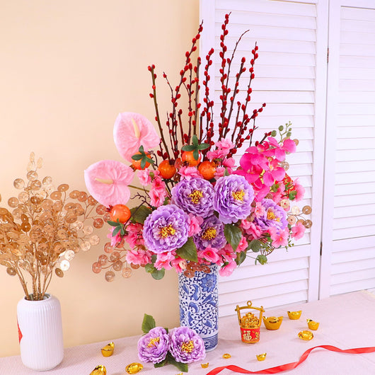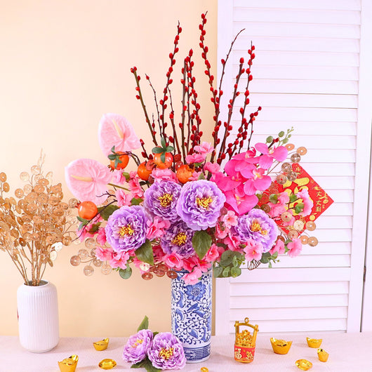 Usher in prosperity this Chinese New Year with a premium Vase arrangement of Artificial Flowers & Fruits, paired with festive Chinese New Year decorations. Cheap price yet elegant, making it the best Chinese New Year gift with same day delivery across Klang Valley...
