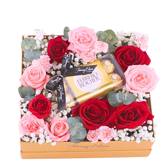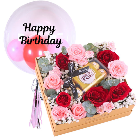 Celebrate love with our Full of Love Box Bundle, a gorgeous bloom box of fresh roses, 16 Ferrero Rocher chocolates, and a charming air balloon. The perfect way to send sweet affection to someone special!