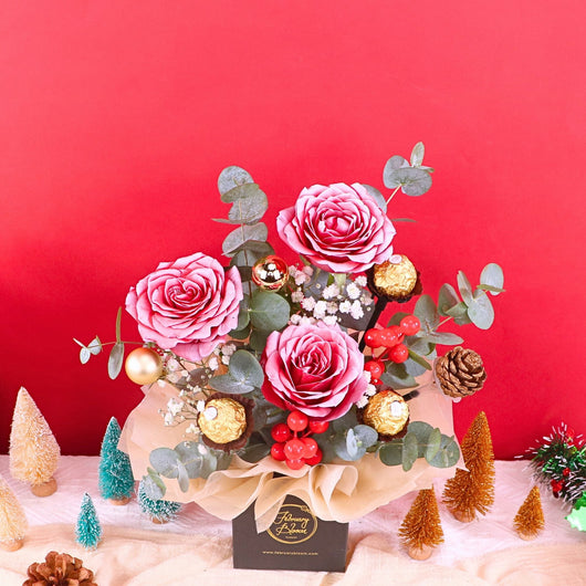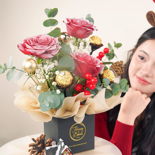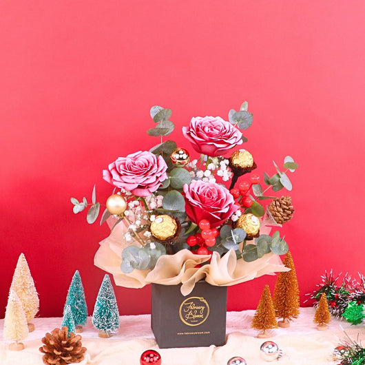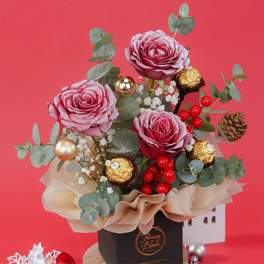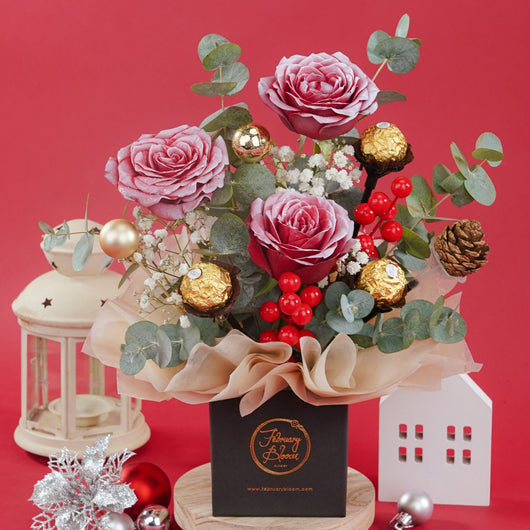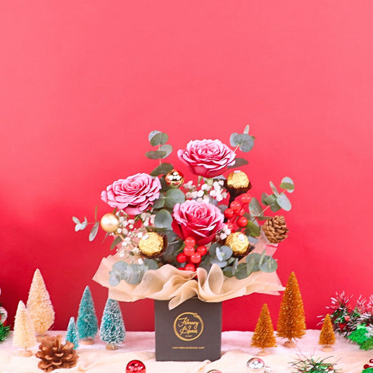Celebrate the festive season with our elegant Christmas Bloom Box featuring fresh flowers, romantic roses and Ferrero Rocher chocolates. A perfect Christmas gift with same day delivery in KL, offered at an affordable price, a delightful blend of beauty and sweetness to impress your loved ones...