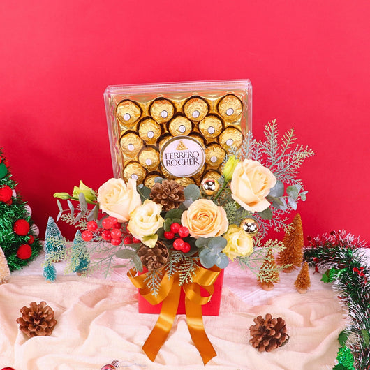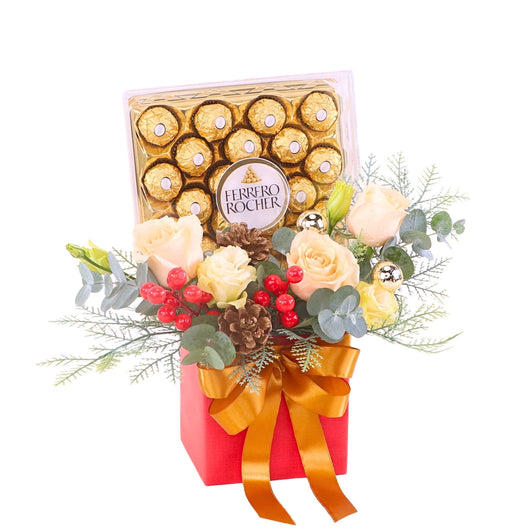 Delight your loved ones this Xmas2025 with our luxurious Christmas Flower & Chocolate Gift Box, artfully arranged with fresh flowers, premium roses & Ferrero Rocher Chocolate. With Christmas gift same day delivery in Kuala Lumpur and an affordable price, it’s the perfect blend of elegance and festive sweetness.