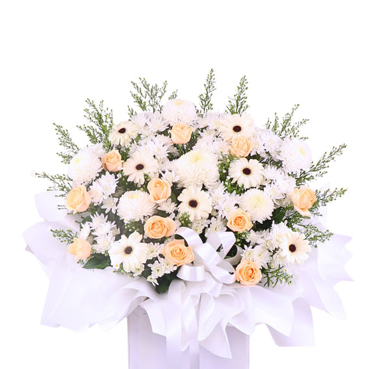 Pay respects to a life lived to the full in Peaceful Paradise, a peaceful condolence flower, shop in Kuala Lumpur. With pure white Mom blooms, white and champagne roses, it radiates peace and true sympathy, offering solace in times of loss.
