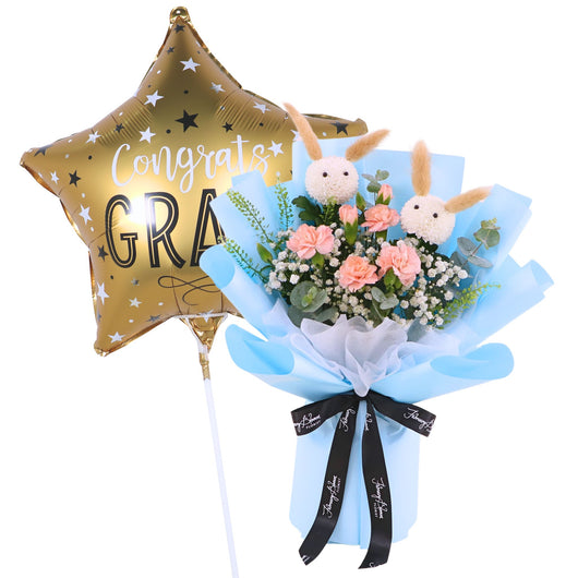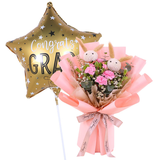 The Happy Bunny Bundle is a playful and joyful way to celebrate graduation! Featuring a cheerful floral arrangement and a festive graduation balloon, this fun bouquet adds a touch of whimsy to their special day. Perfect for sending congratulations with a smile!