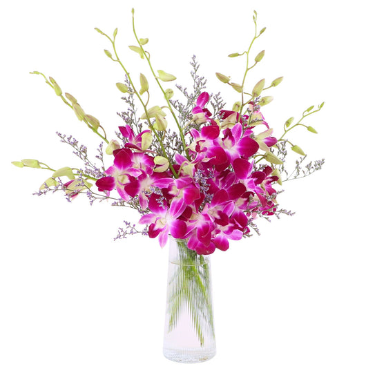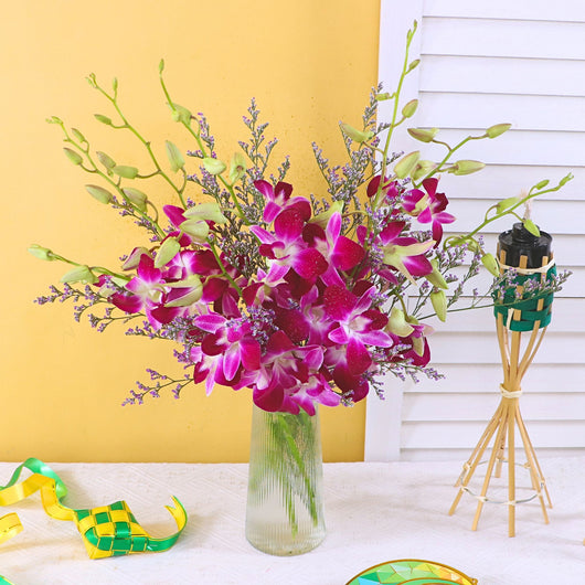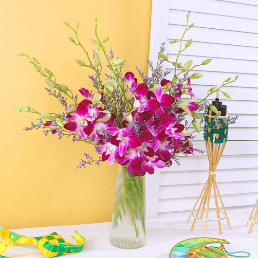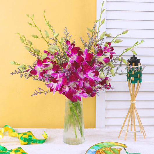 Enhance your festive gifting with an Affordable Hari Raya Gift featuring a stylish vase arrangement of fresh flowers and elegant purple Dendrobium orchids by February Bloom Florist. Perfect for cheap online Aidilfitri gift delivery in KL near me with beautiful presentation and same day service.