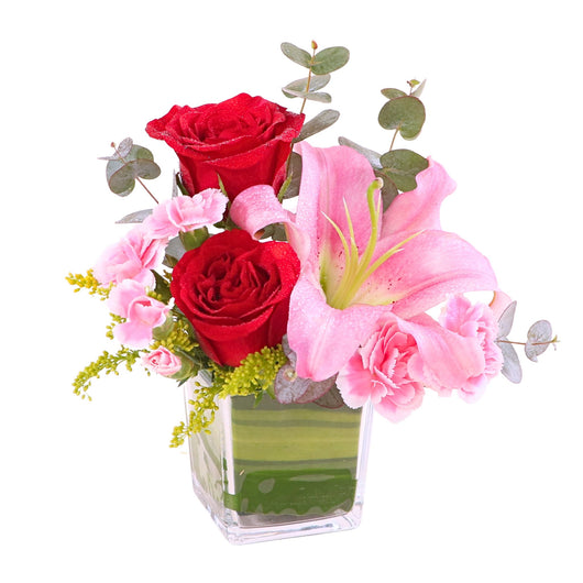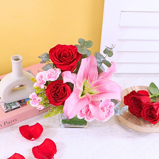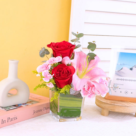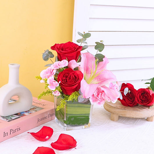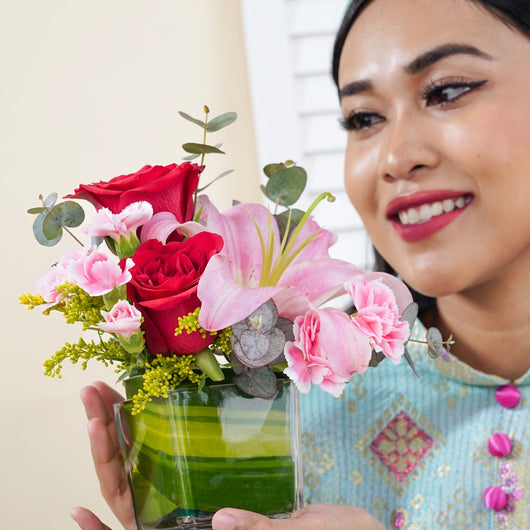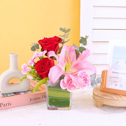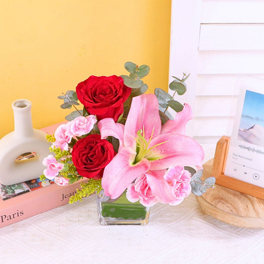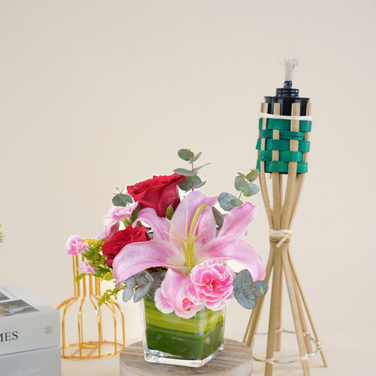 Discover an Affordable Hari Raya Gift featuring a beautiful vase arrangement of fresh flowers with elegant lily and roses, crafted by the best florist in KL. Perfect for cheap online Aidilfitri gift same day delivery in KL near me, offering stylish presentation at a budget friendly price...