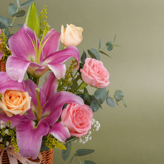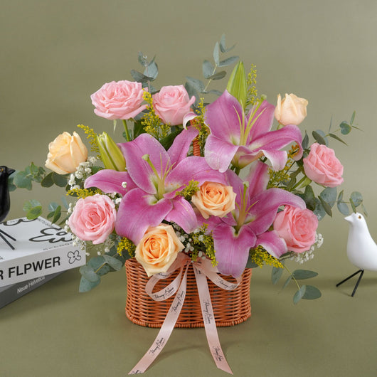 Send You a Smile Today Flower Basket features fresh Sunflowers and Roses, bringing warmth, joy, and a smile to any space. A perfect way to brighten someone's day with nature's beauty.