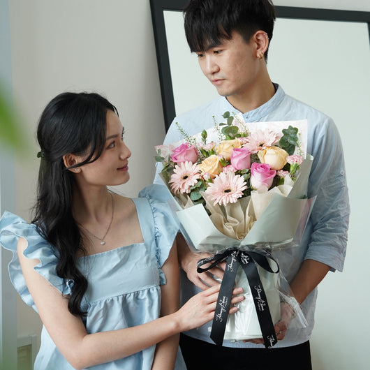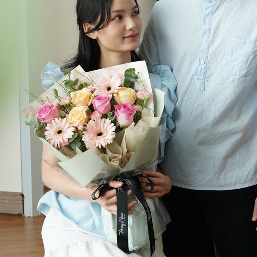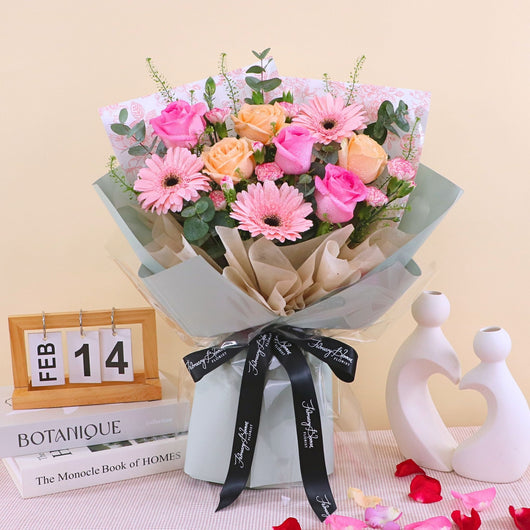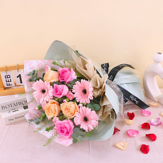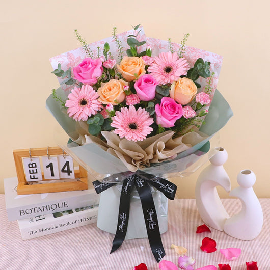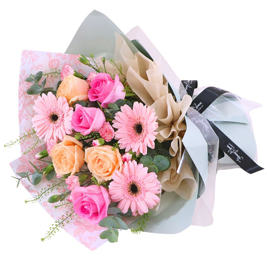 Package Size Standard (9 stalks) RM 209 Included Pink&Champagne Rose , Pink daisy , Carnation spray , Thilaspi , eucalyptus |